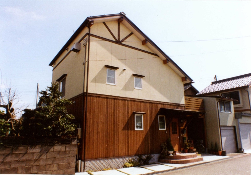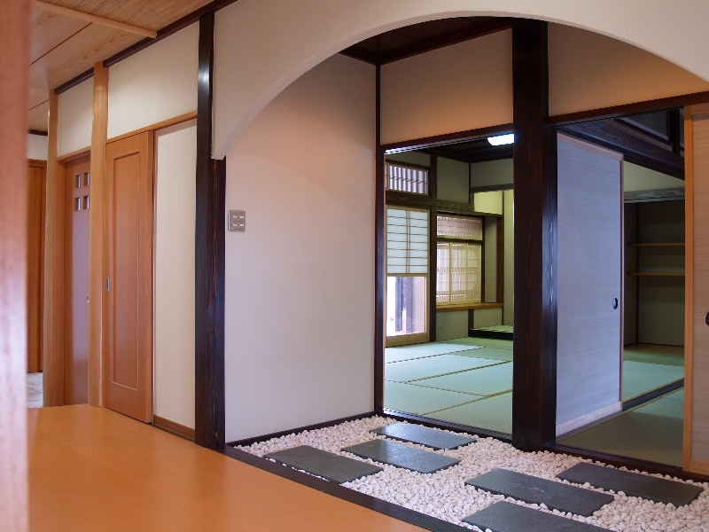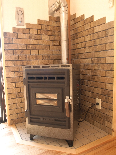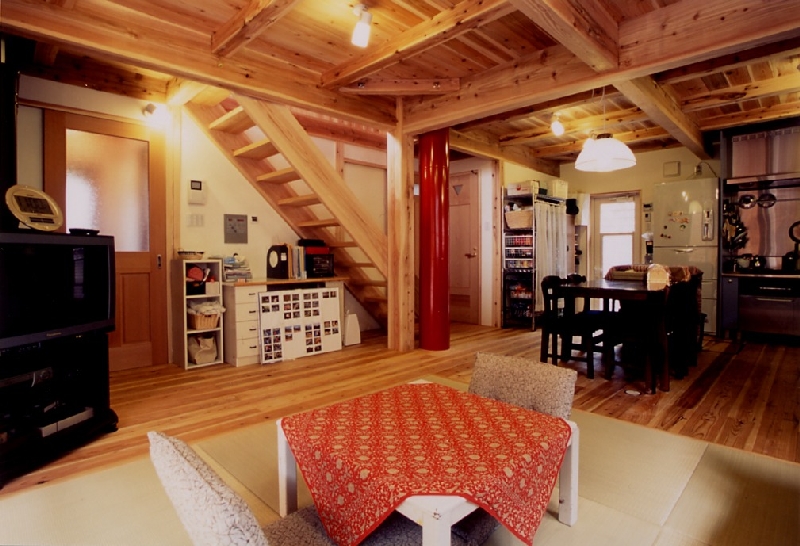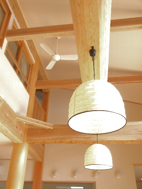 吹き抜け空間には、直径36cm磨き丸太と24cm角柱の大黒柱が合わせて5本。 床板には、足触り感が柔らかく温かな無垢の県産スギのフローリング。 暖房は、ペレットストーブ。 自然素材いっぱいのエコハウスです。 リビングリビング